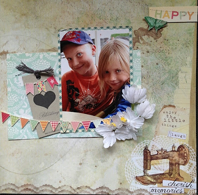 Jag deltog i en utmaning som handlade om att arbeta med scrapsaker man inte tycker är så himla roliga... Alla skulle ta med tre saker - och sen skulle vi välja tre saker vardera utav dem. Jag valde tre blå papper, några filtfigurer och en plast-datum-journalcirkel.