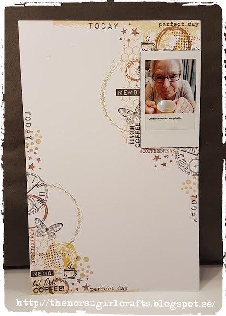 - Jag har tagit bort masken och stämplat en snurr-swirl (Joy! Crafts) med Antique linen distress oxide ink.
